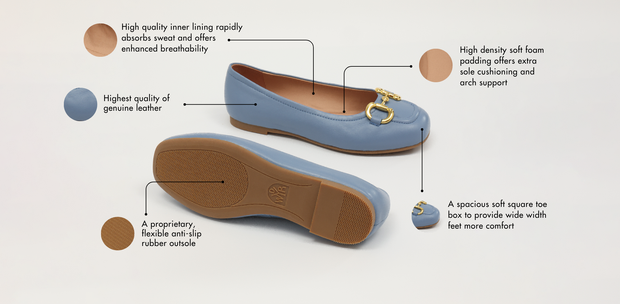 - Non-slip flexible natural rubber sole with proprietary design